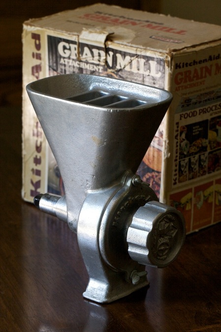 I’ve been grinding my own flour for several years now. Up until last week I was using a hand-me-down KitchenAid Grain Mill Attachment. It’s a oldie, and has been passed around through many hands. My dad’s cousin bought it back a long time ago and after she quit using it she gave it to my mom who used it for a while. My sister borrowed it and used it until she bought a NutriMill Grain Mill. Back to my mom it went. She used it for grinding up lentils and other grains to make her own dog food, but never used it for homemade flour. When I bought some grain with my sister, I borrowed it from my mom and started using it to make flour for baking. I had an old Kitchenaid that I attached it to and that one finally died, so it was time to upgrade to a real mill.